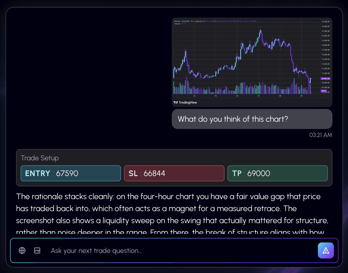 Take a screenshot of your chart. Drop it into Trade AI. Get instant feedback on your setup before you pull the trigger.